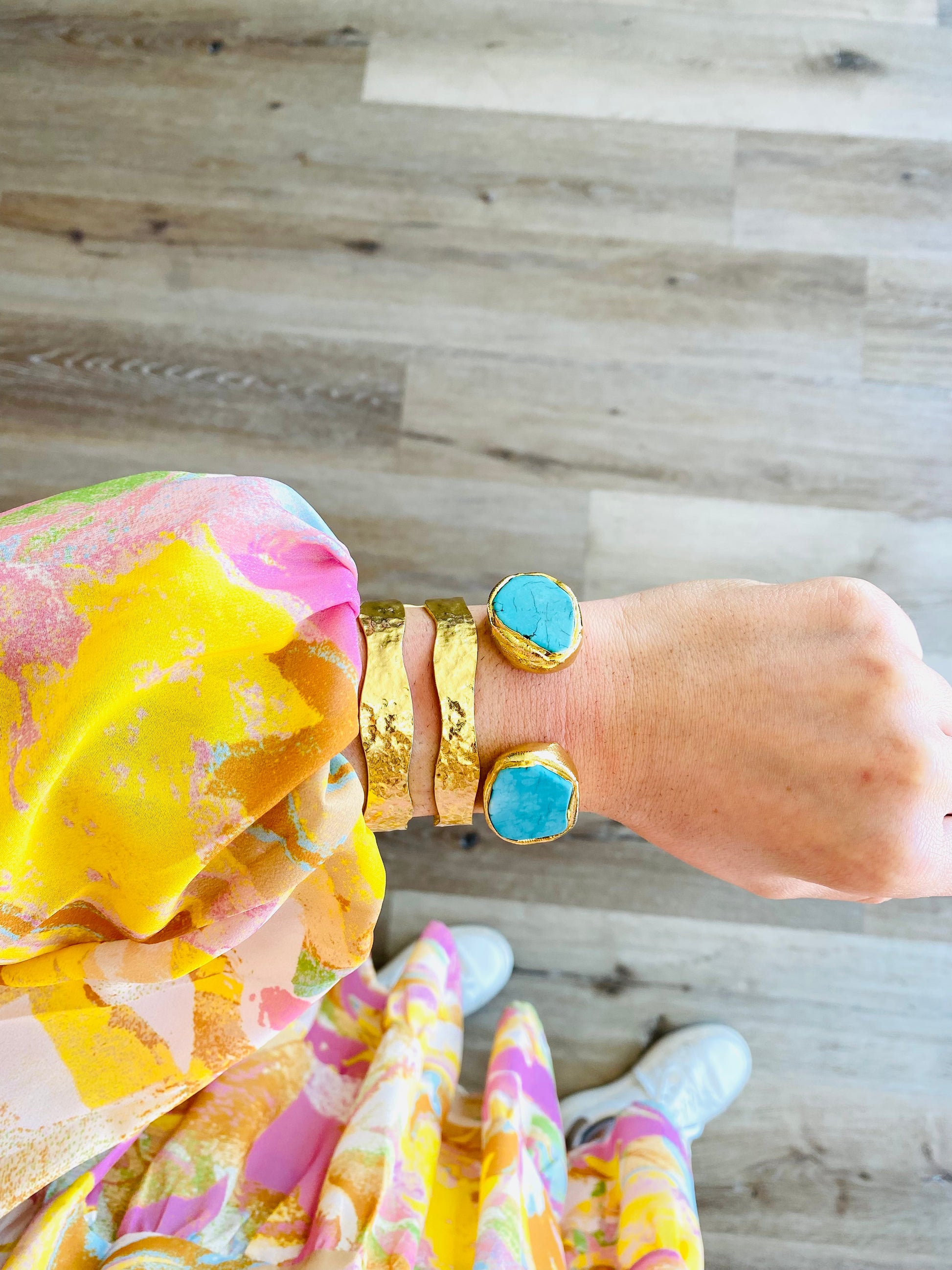 Add a touch of elegance and sophistication to your outfit with our 18K Gold Mist Medium Cuff. Handcrafted with care, this cuff features a pink turquoise stone from Easton Elle and is dipped in 18K gold for a luxurious touch. Elevate your style and make a statement with this stunning piece!