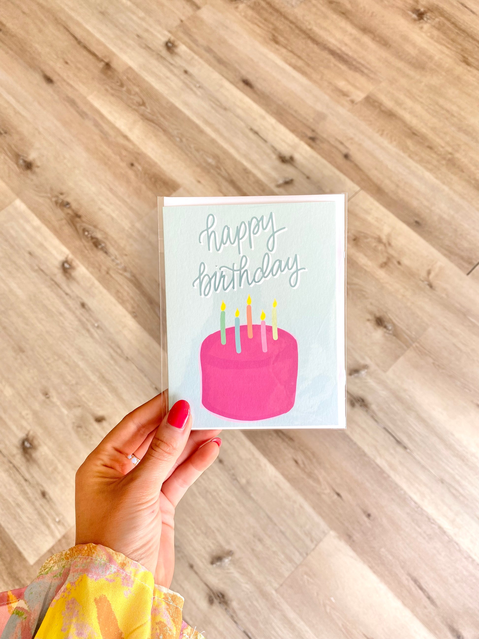 Birthday Cake Greeting Card. Each card is folded to 4.25" tall by 5.5" wide, is blank inside and comes with a matching white envelope. Cards are packaged in cellophane sleeves.
