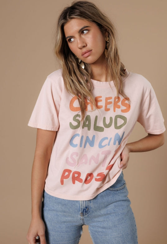 Raise your style and your spirits with the 'Cheers' Wide Neck Tee. Designed for comfort and a relaxed fit, this tee invites you to celebrate every moment with a nod to good times and great company. Whether you're saying cheers, salud, cin cin, santé, or prost, this shirt is your perfect companion for casual gatherings and lively conversations. Embrace the joy of connection in a tee that’s as inviting as your favorite toast.