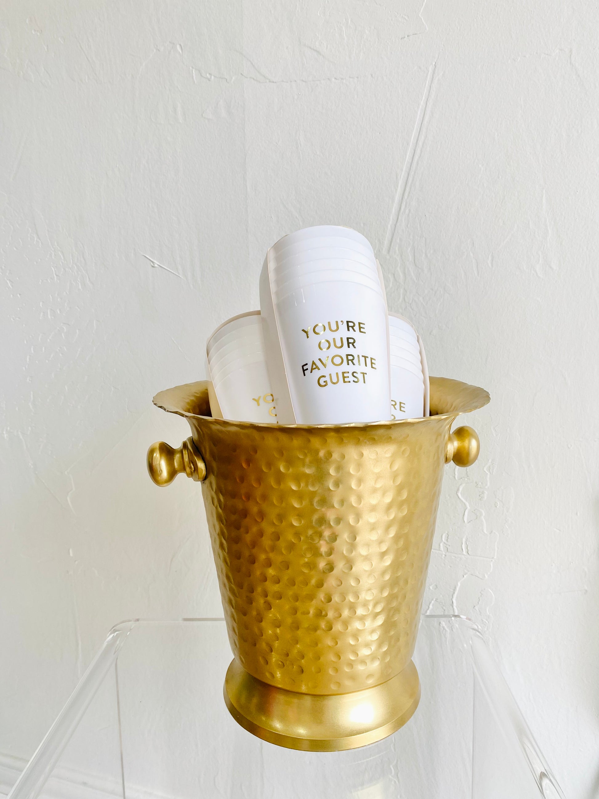 Frost cups are the perfect reusable cup for events, gatherings and everyday use! •Made of frosted plastic with a snarky phrase, "You're Our Favorite Guest", in gorgeous gold foil. The perfect party starter with 6 cups per pack!