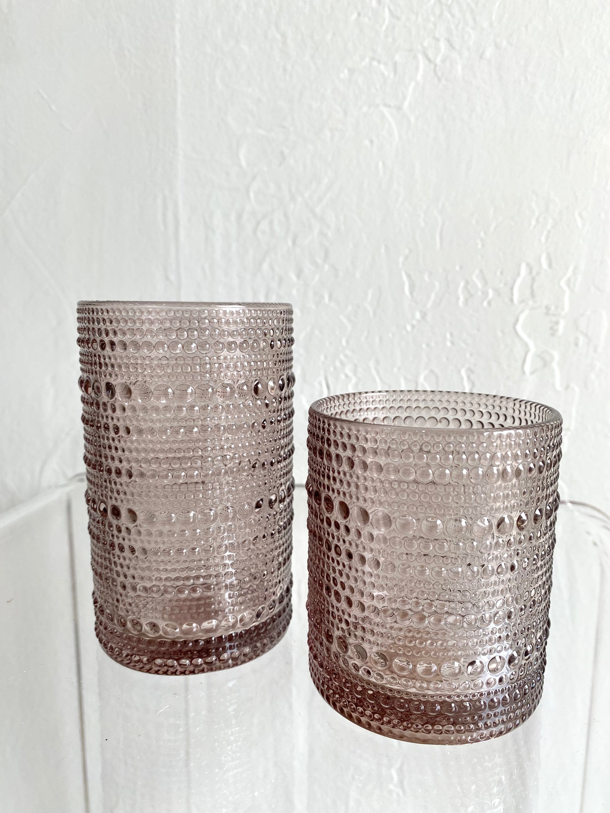 Your new favorite glasses! With two different-sized glasses to accommodate various beverages and preferences. One glass holds 11 ounces, while the other has a capacity of 14 ounces. This variety allows you to serve everything from cocktails and wine to water and juice with ease. Their hobnail texture adds a playful and tactile element to your drinkware, enhancing the overall visual appeal.