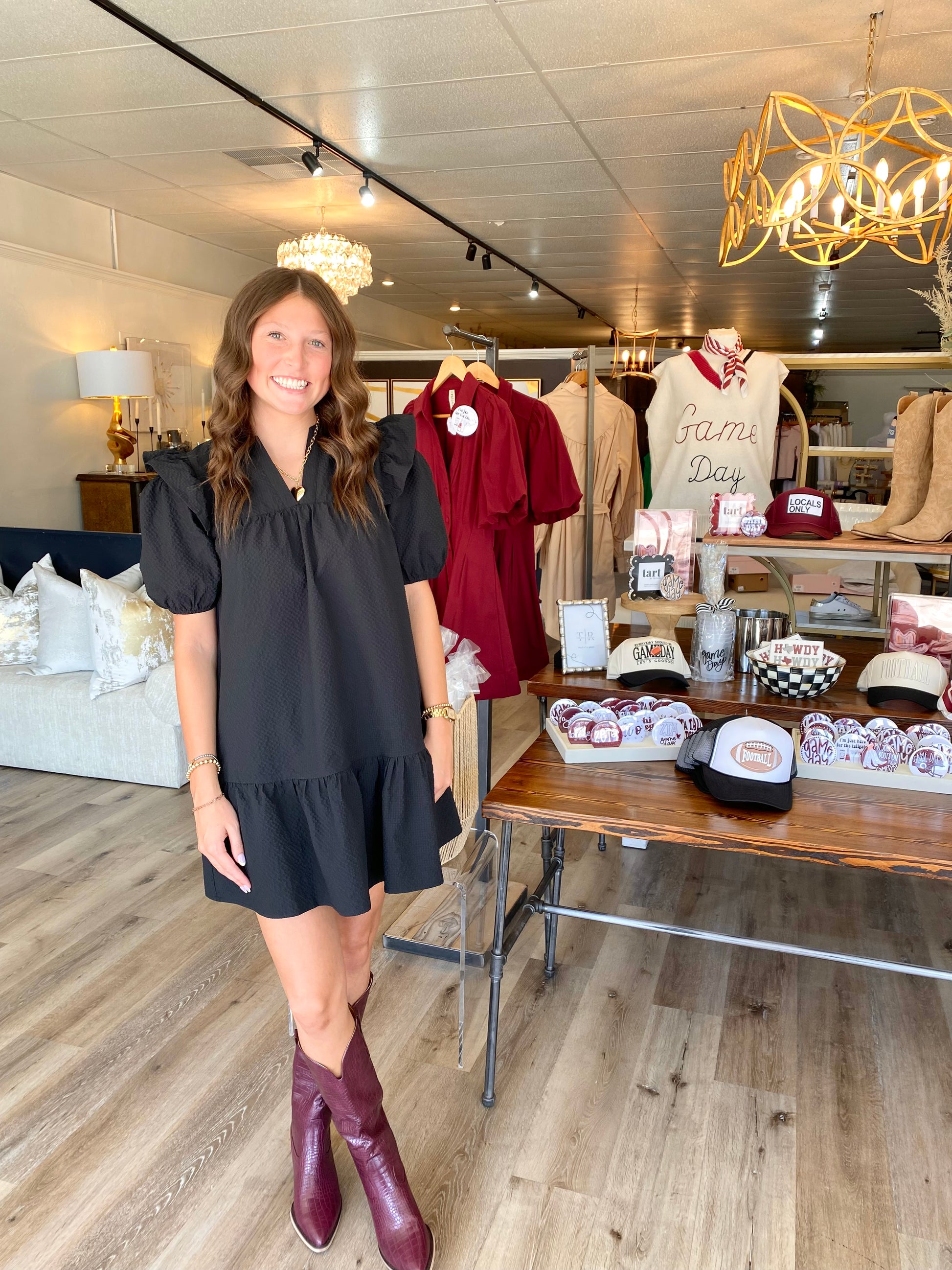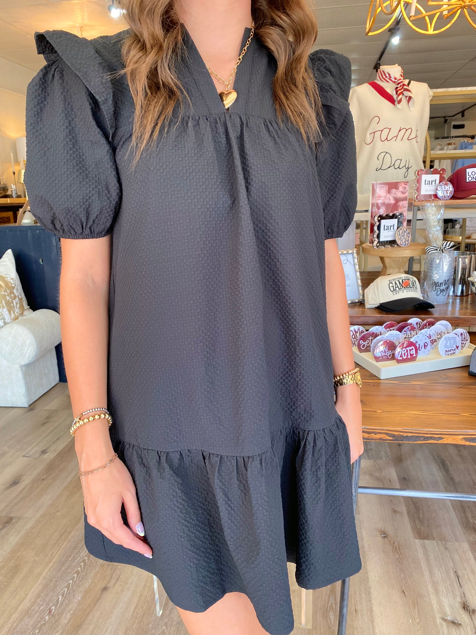 Elevate your wardrobe with this black V-neck textured dress, designed to combine elegance and comfort effortlessly. Its flattering neckline and subtle texture add depth and sophistication, making it perfect for both day and evening occasions. Experience a versatile piece that enhances your silhouette while providing all-day confidence and style.