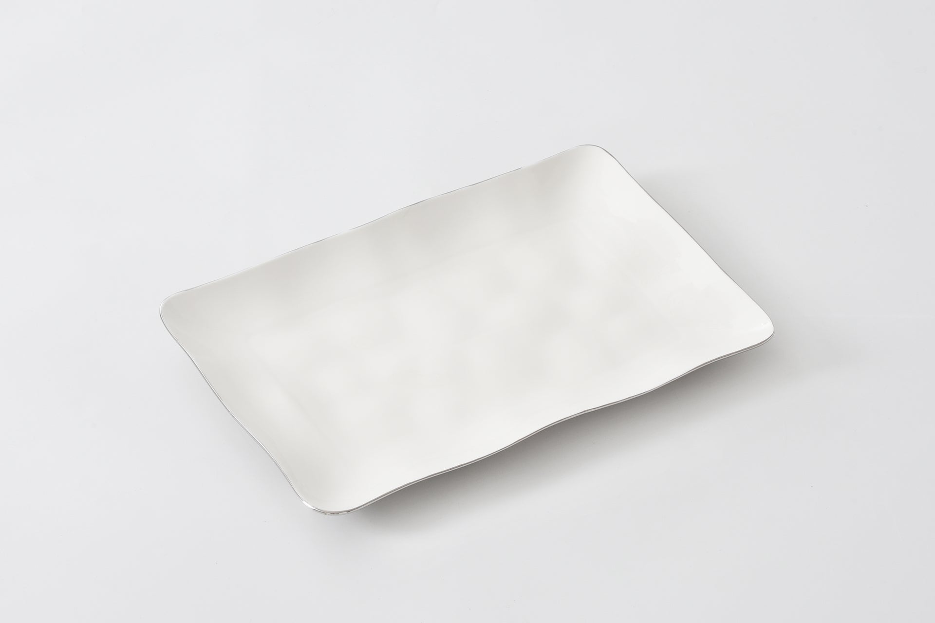 Rectangular Platter in Thin & Simple. In casual and formal settings, this tray can be used to serve the main course, your favorite grilled vegetables or even dessert! A perfect platter for creating your next charcuterie board! Crafted in a luxurious white high-fired porcelain and dazzling silver. Food safe, dishwasher safe, oven safe to 500°. Tarnish and stain-free. Easy Care.