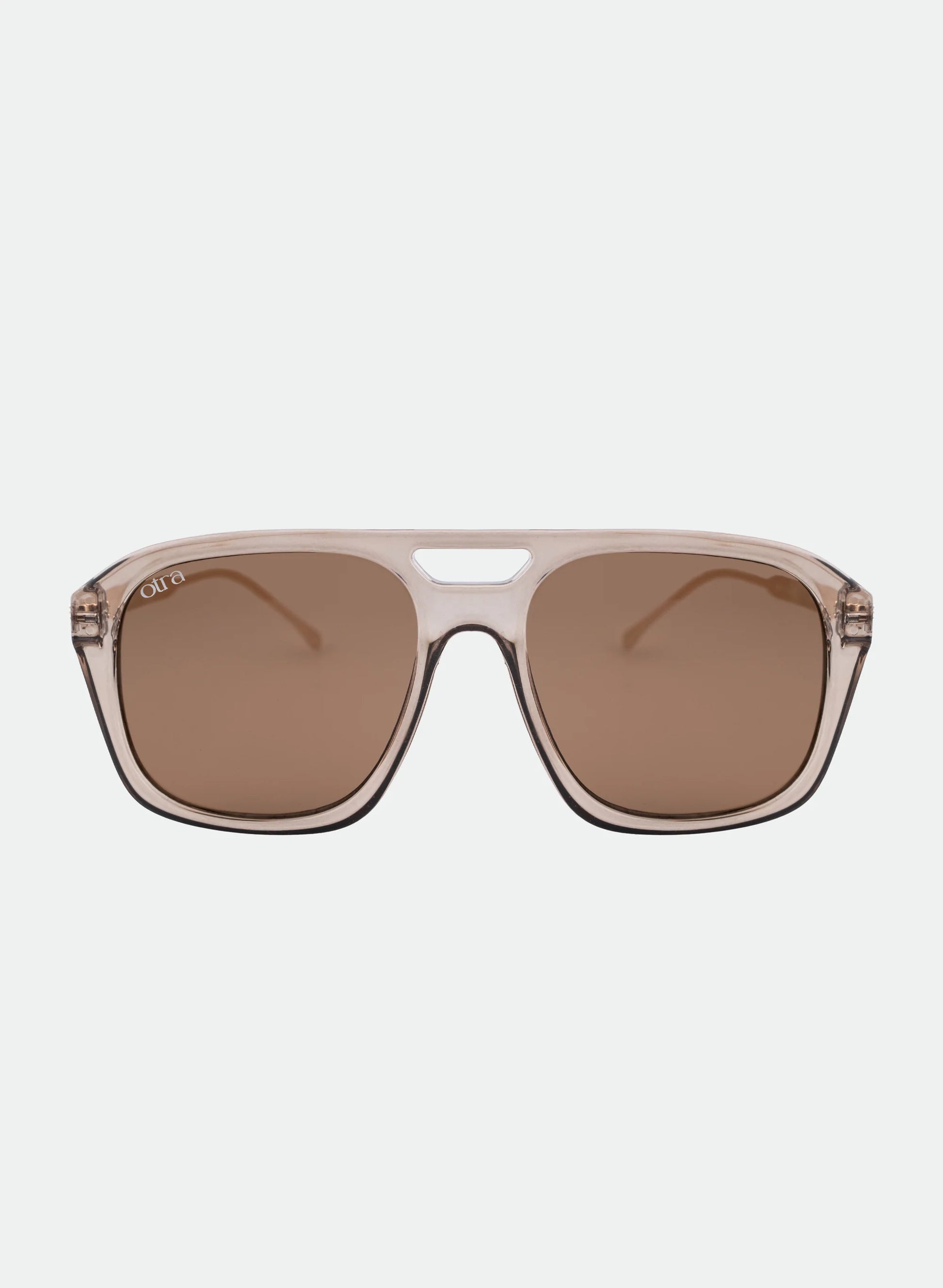 Reina is an oversized rounded frame in transparent olive, blending soft structure with understated boldness. Paired with warm brown lenses.