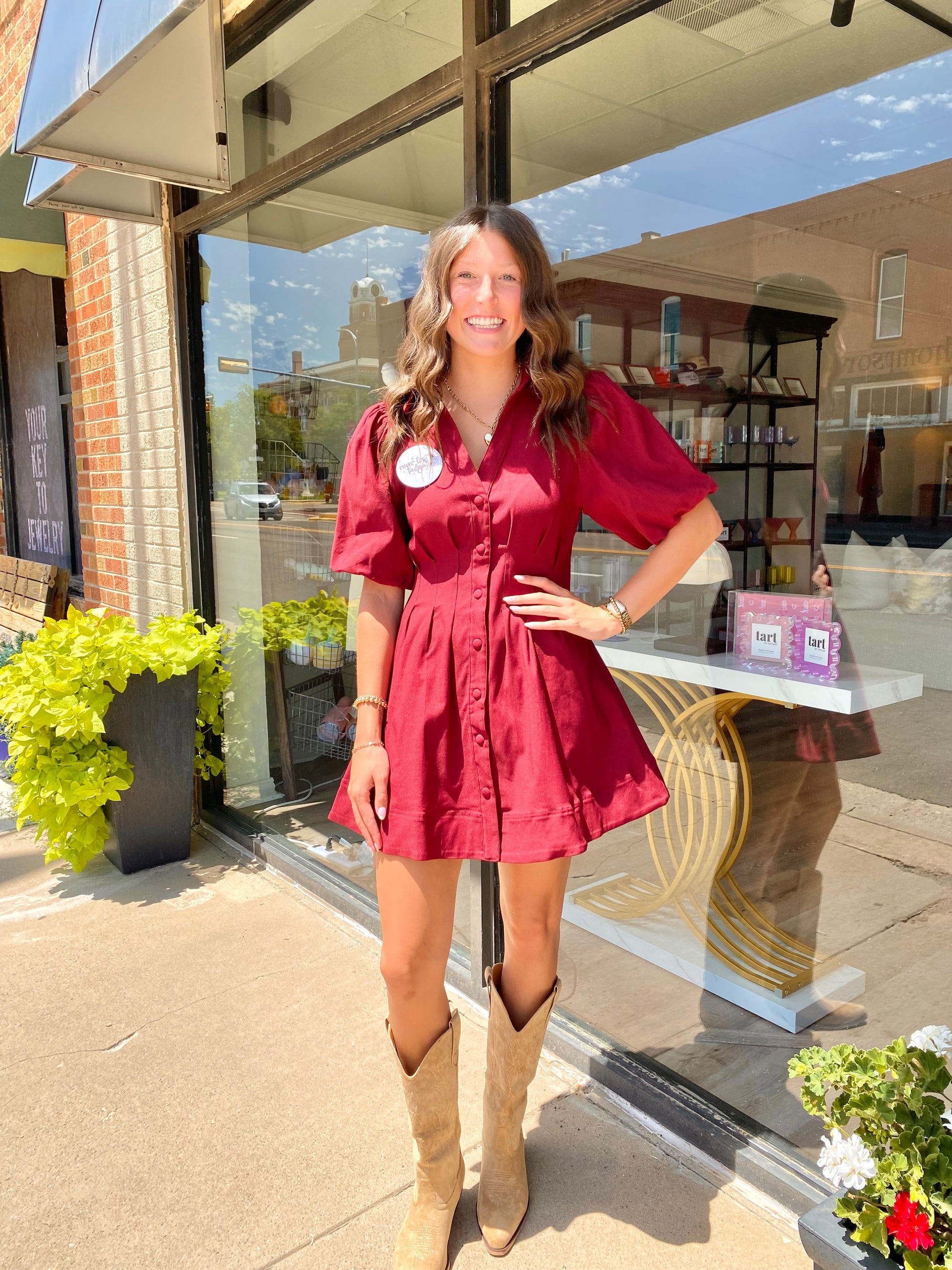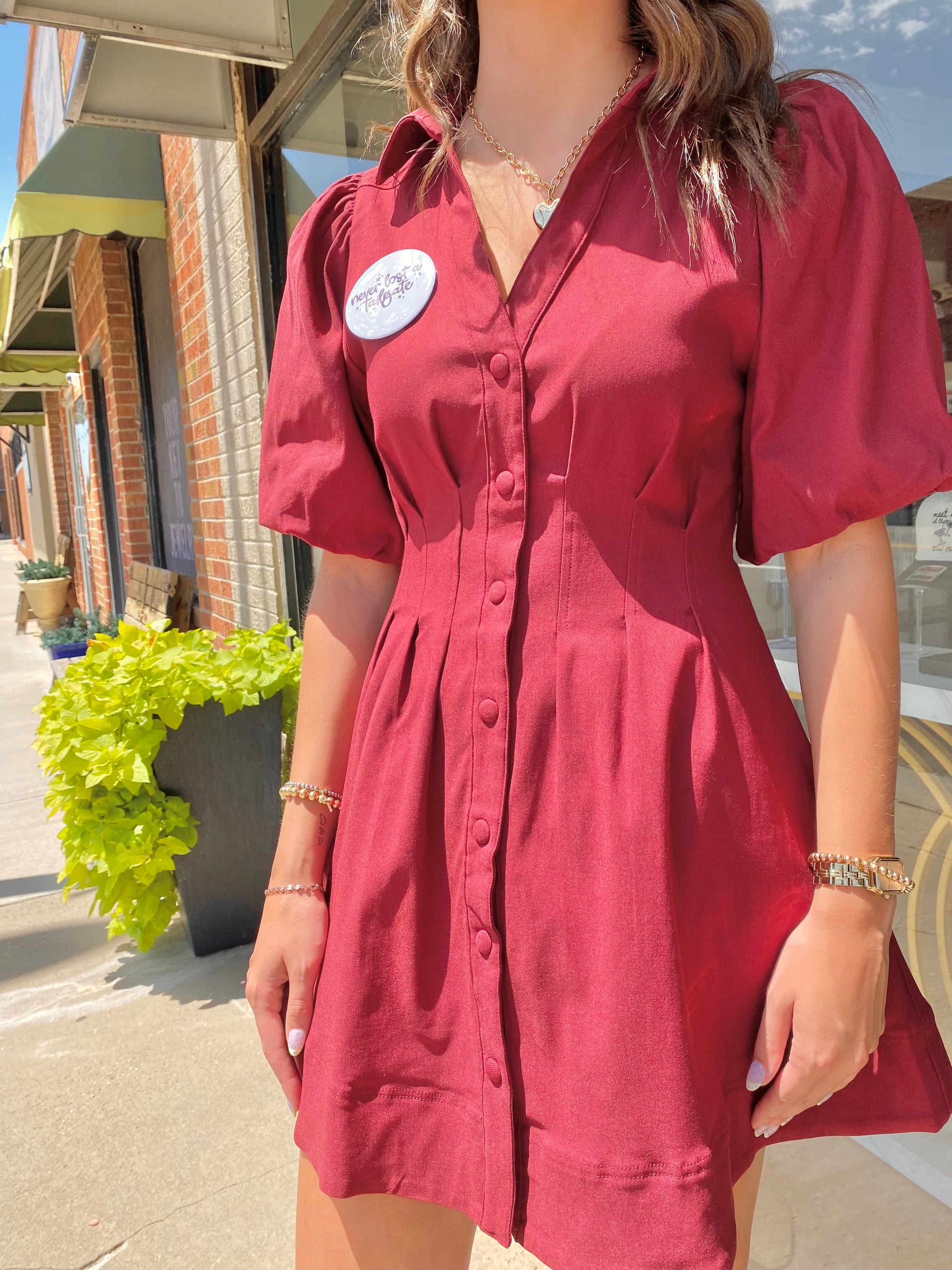 Elevate your wardrobe with the Sadie Balloon Sleeve Dress, featuring a rich maroon hue and elegant point collar. Crafted from a comfortable blend of rayon, chinlon, and spandex, it offers a flattering fit with gentle stretch. The balloon sleeves add a stylish, feminine touch, while the polyester lining ensures smooth wear. Perfect for making a statement at any occasion, this dress combines sophistication and comfort effortlessly.