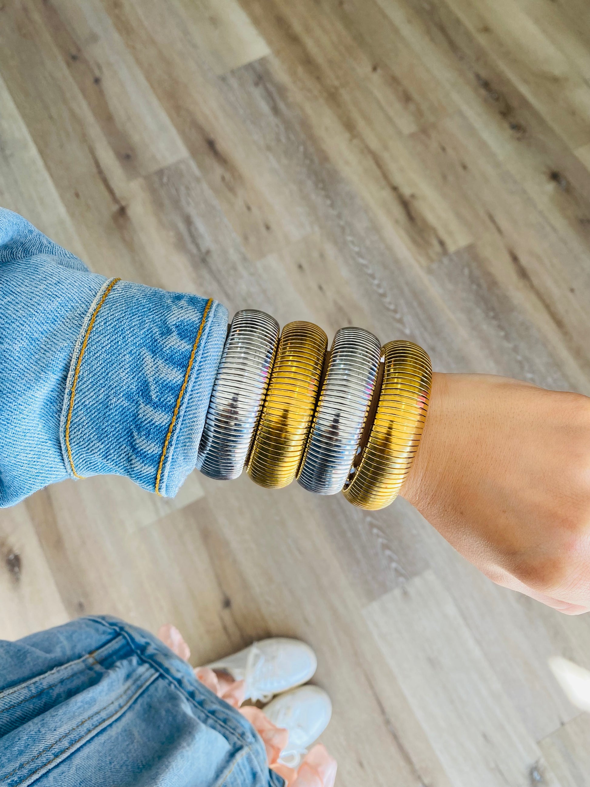 Elevate your style with the 'She's Bold' Silver Bracelet by Bracha. This 1-inch wide, sturdy bangle adds a touch of boldness to any outfit. With a 7.5" inside circumference, it's the perfect fit for a variety of wrist sizes. Made with gold plating over stainless steel, this bracelet is water and tarnish resistant.