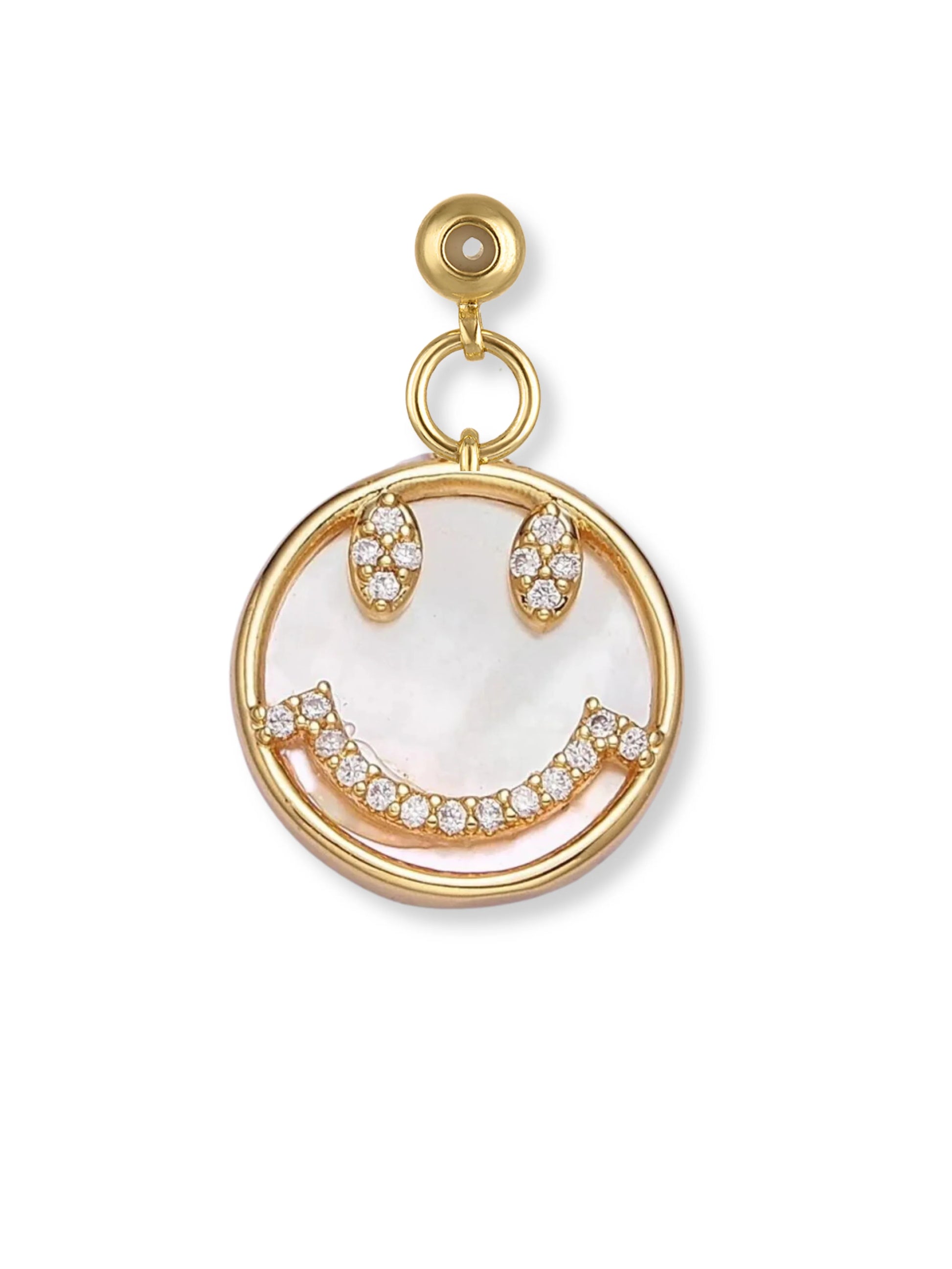 - A circular frame is accentuated with a mother-of-pearl base, while the iconic charm bedecked with CZ stones mimics eyes and a smiley face. Framed in a sleek gold detailing finish, the charm is crafted to brighten every moment.