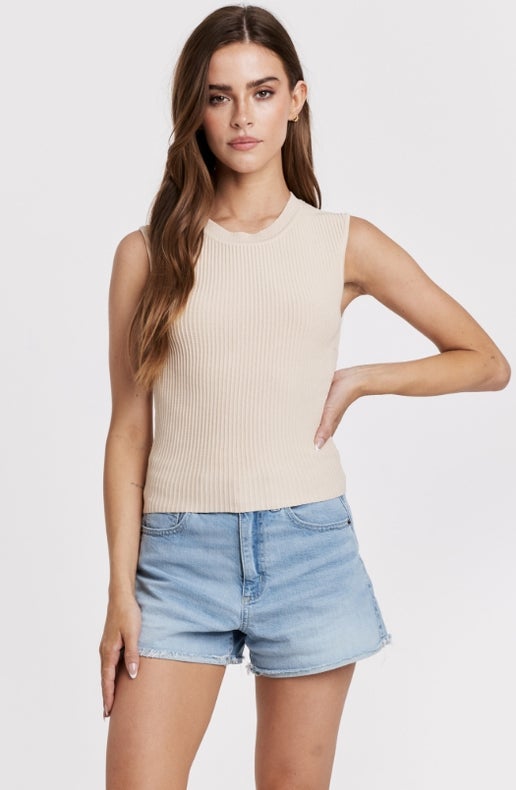 Muscle rib tank ribbed, high neck finished sleeveless with weaved self neck band & hem. Casual comfort, looking ever relaxed & ready for all adventure. Utility 24/7! Solid color yarn fitted.