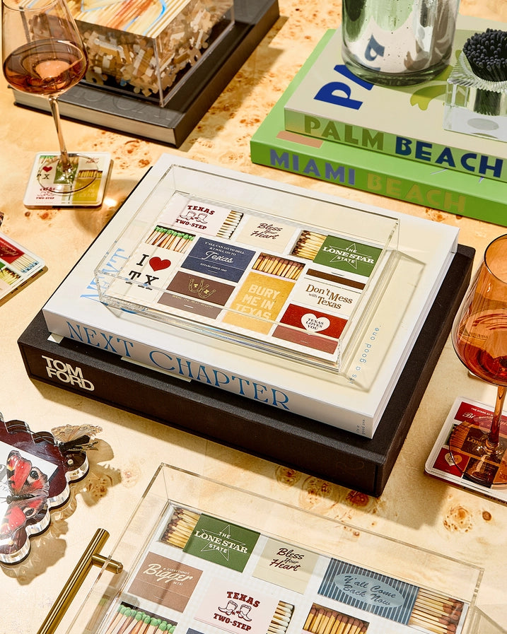 Serve up some Texas flair with our Texas Matchbook Small Tray! This durable acrylic tray features a fun, Texas-themed matchbook design and is the perfect accessory for any party or gathering. Show off your love for the Lone Star state while serving up drinks and snacks in style! Yee- Haw! -Size: 6.5’’ L x 9.5’’ W x 1.5’’ H -Made of acrylic -Handmade with love in Dallas, Texas -Use a soft damp cloth to clean and keep inside.