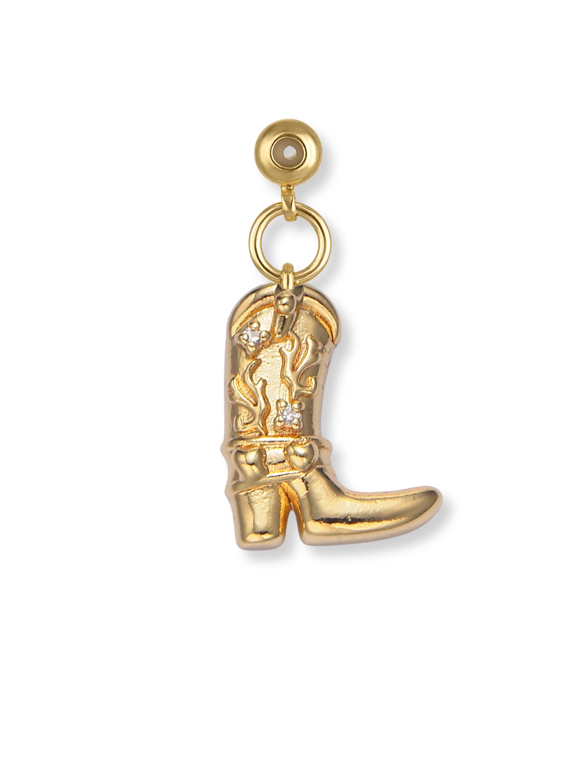 - Inspired by the classic cowboy boots, this charm features calf-length boot with a block heel and an edgy toe silhouette. Bedecked with ornate floral engravings and CZ gemstones that add rugged elegance.